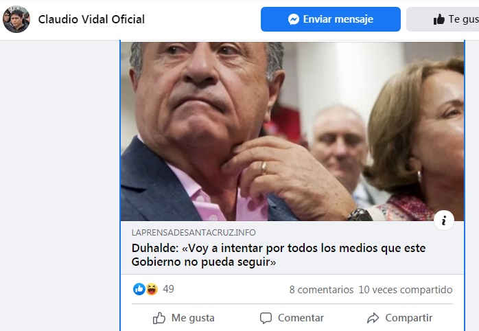 Nacionales-, Claudio Vidal manifestó duras declaraciones contra Duhalde, donde textualmente manifestó lo siguiente: Una vez más escuchamos a Eduardo Duhalde expresar palabras que más que generar controversias, deberían llamarnos a la reflexión y el rechazo. Lamentablemente, no es el único que se comporta así en el escenario político nacional. Los viejos referentes políticos deberían dar ejemplo, y no expresar ideas que puedan generar violencia o avivar posturas destituyentes.